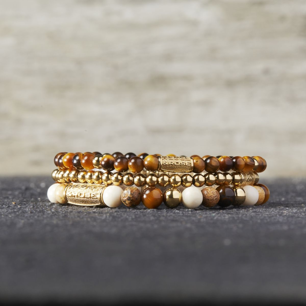 Armband van het merk Rebel & Rose. De armband heeft een hoogwaardige elastische stretch koord, met 6mm van Fossil, Jaspis, Tijgeroog.