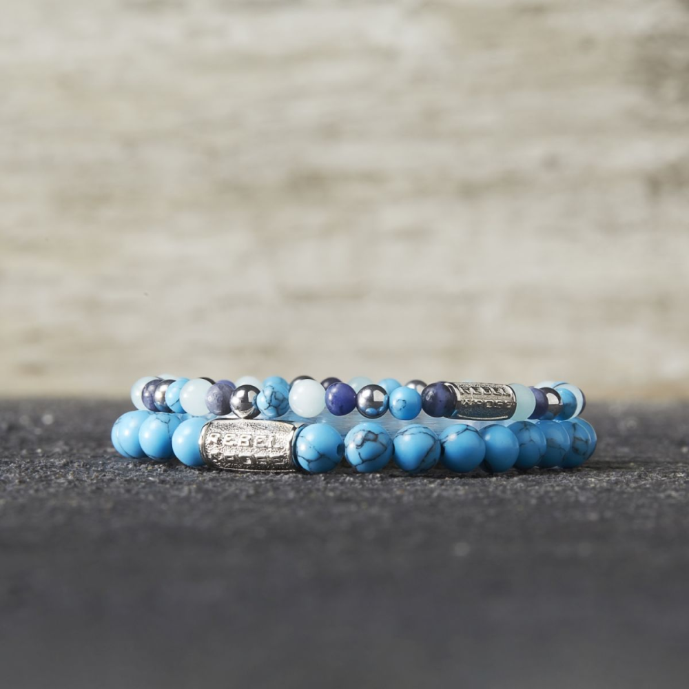 Armband van het merk Rebel & Rose. De armband heeft een hoogwaardige elastische stretch koord, met 4mm van Sodaliet Blauw, Hematiet Zilver, Art. Turquoise, Zwart, Jade Blauw.