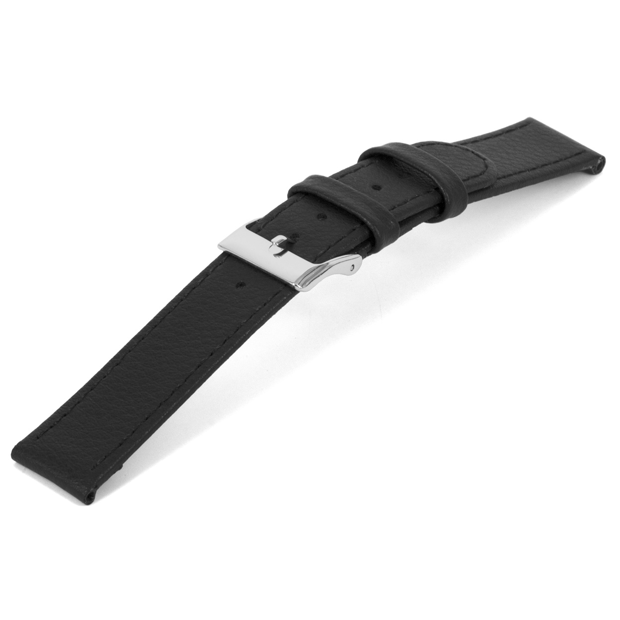 Zwart lederen horlogeband met zilverkleurig edelstalen gesp.