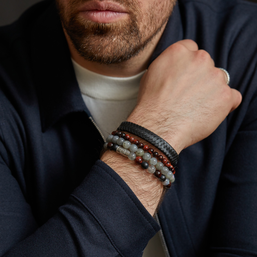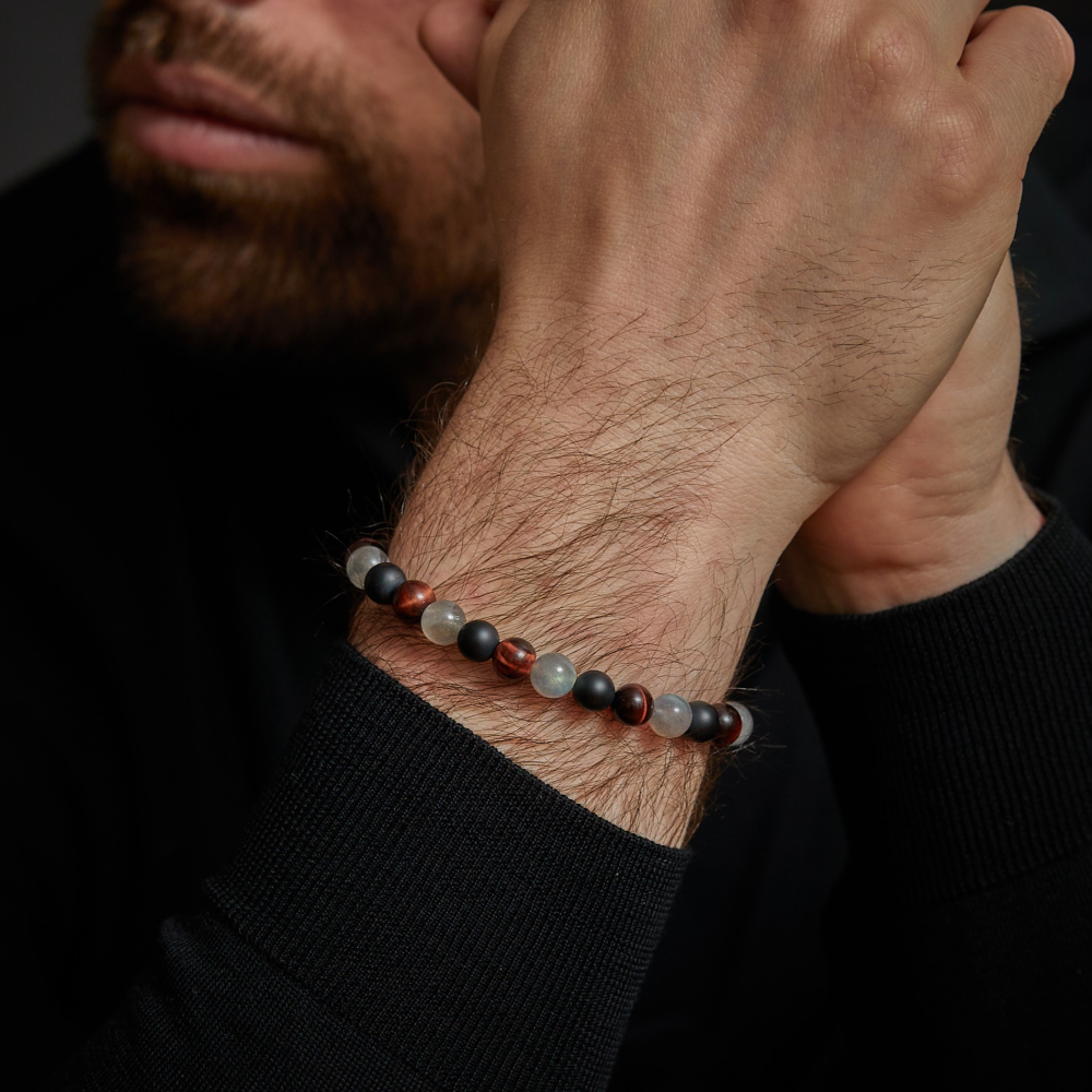 Armband van het merk Rebel & Rose. De armband heeft een hoogwaardige elastische stretch koord, met 8mm van Onyx, Rode Tijgeroog, Labradoriet.