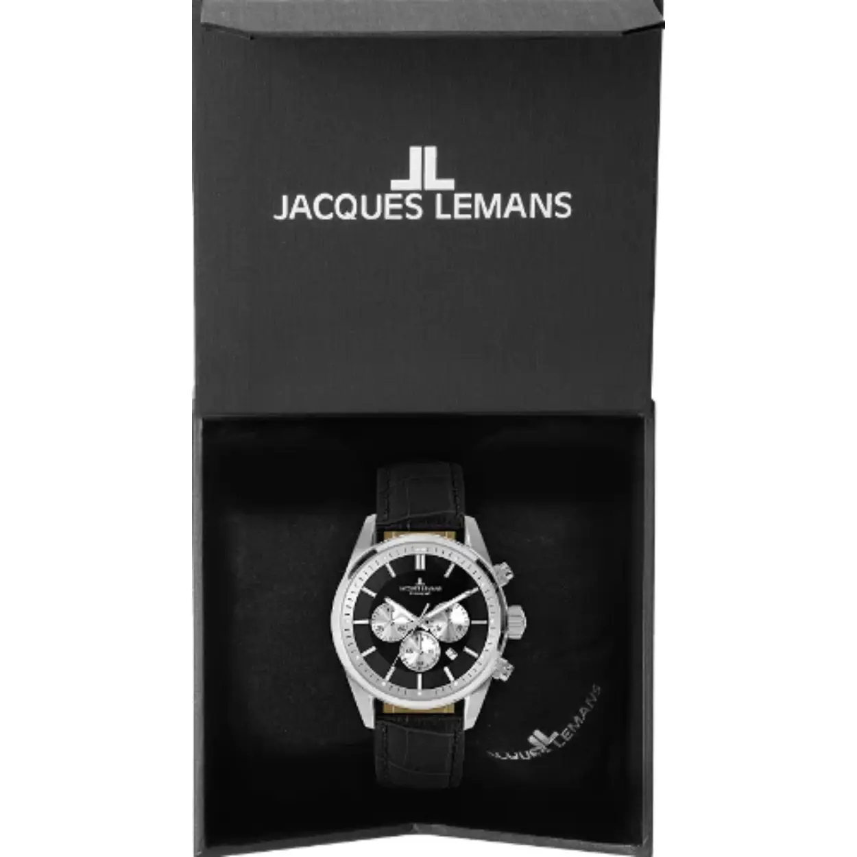 Dit  heren horloge is van het merk JACQUES LEMANS. Het is een horloge met een band gemaakt van lederen. De diameter van de kast is 42 mm.