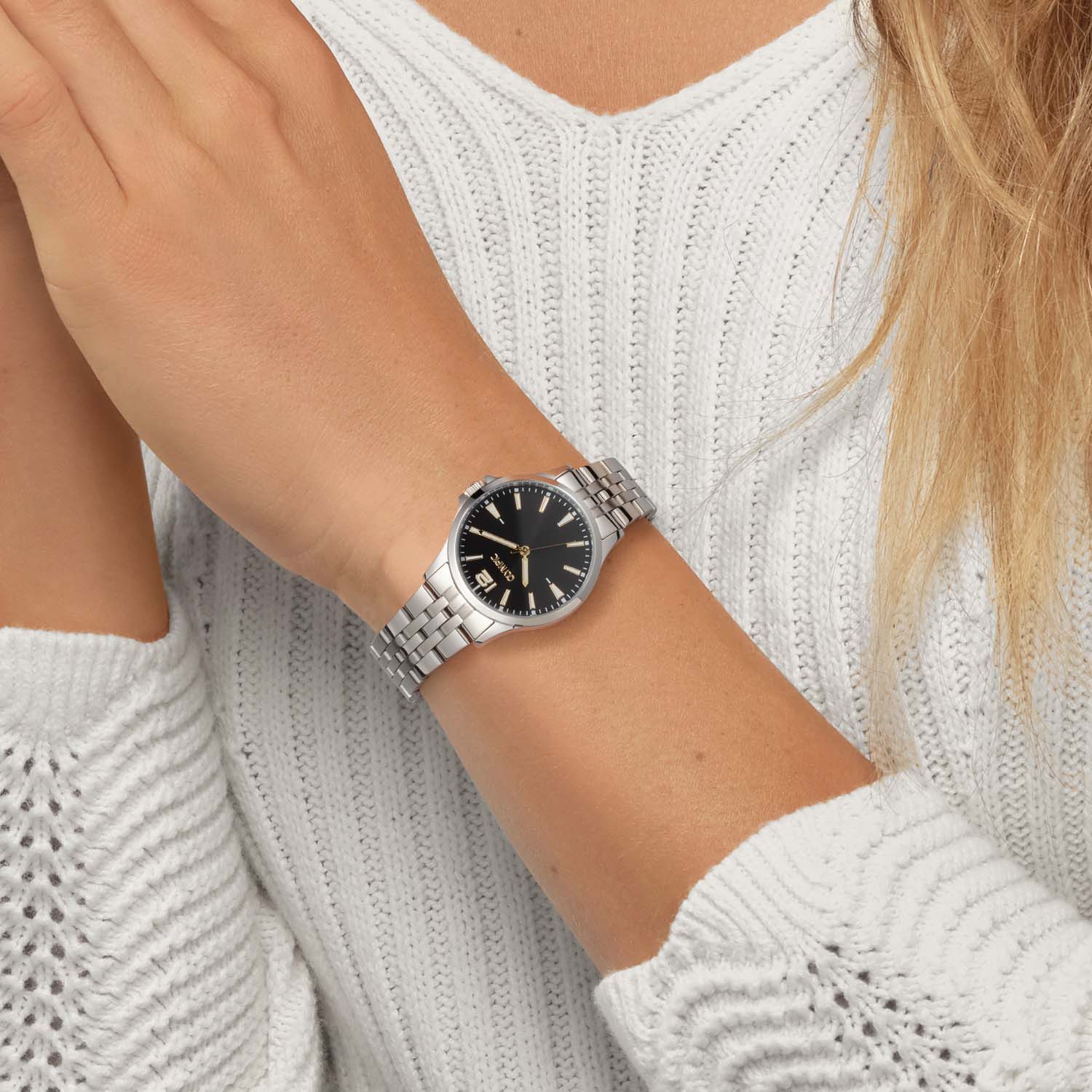 Dit unieke Olympic horloge met artikelnummer: OL72DSS109 is een dameshorloge met een classic sportieve uitstraling. Het horloge heeft een ronde stalen kast met een zwarte wijzerplaat met de 12, streepjes en goudkleurige en lumibrite accenten. Aan de kast zit een stalen schakelband met vouwsluiting. Het horloge heeft een mineraalglas, een doorsnee van 32mm en is 5ATM.