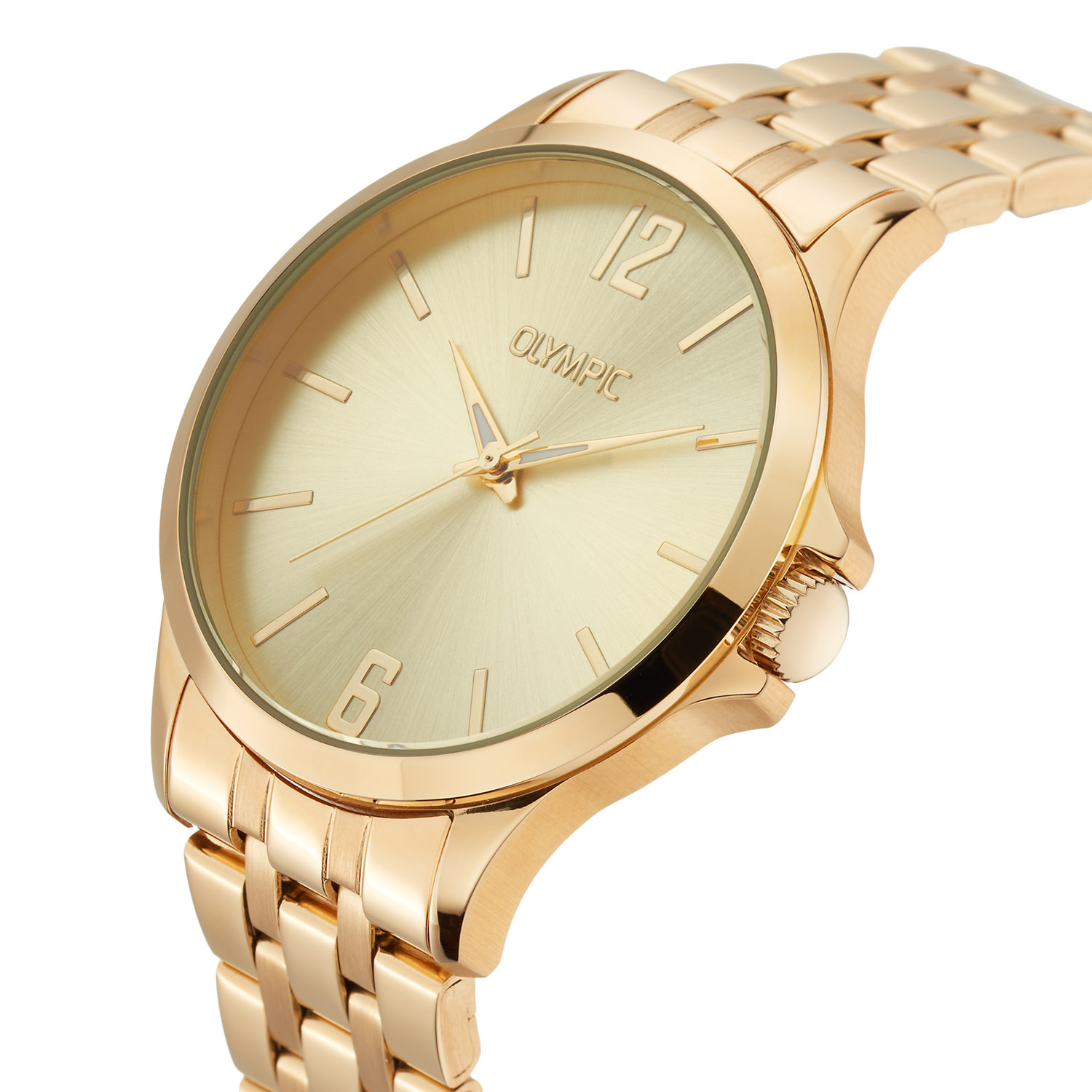 Dit unieke Olympic horloge met artikelnummer: OL72HDD013 is een herenhorloge met een classic sportieve uitstraling. Het horloge heeft een ronde goudkleurige stalen kast met een goudkleurige wijzerplaat met de 12 en de 6 in Romeinse cijfers en de andere uursaanduiding in strepen. Aan de kast zit een goudkleurige schakelband met een vouwsluiting. Het horloge heeft een mineraalglas, een doorsnee van 40mm en is 5ATM.