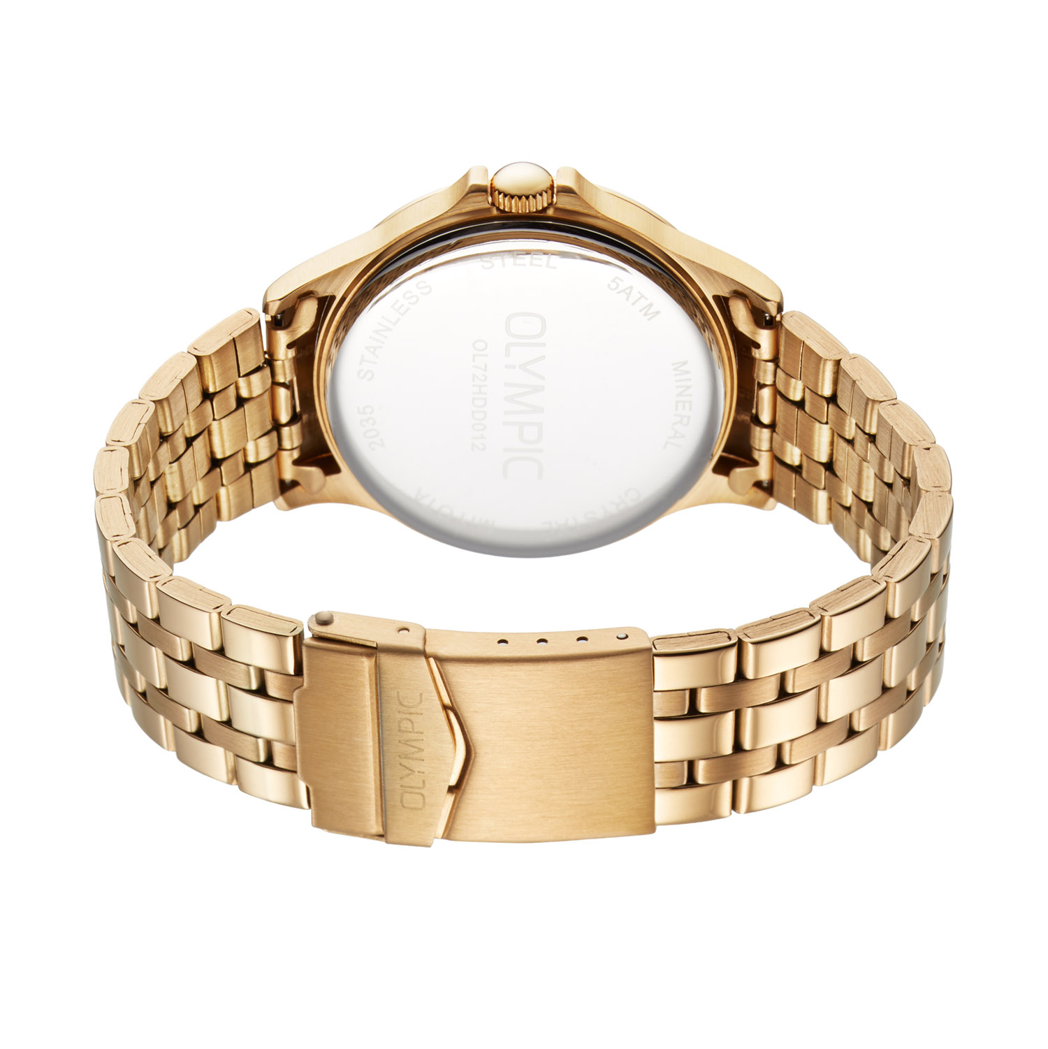 Dit unieke Olympic horloge met artikelnummer: OL72HDD012 is een herenhorloge met een classic sportieve uitstraling. Het horloge heeft een ronde goudkleurige stalen kast met een groene wijzerplaat met de 12 en de 6 in Romeinse cijfers en de andere uursaanduiding in strepen. Aan de kast zit een goudkleurige schakelband met een vouwsluiting. Het horloge heeft een mineraalglas, een doorsnee van 40mm en is 5ATM.