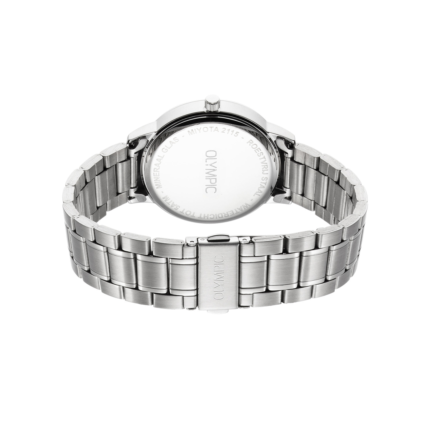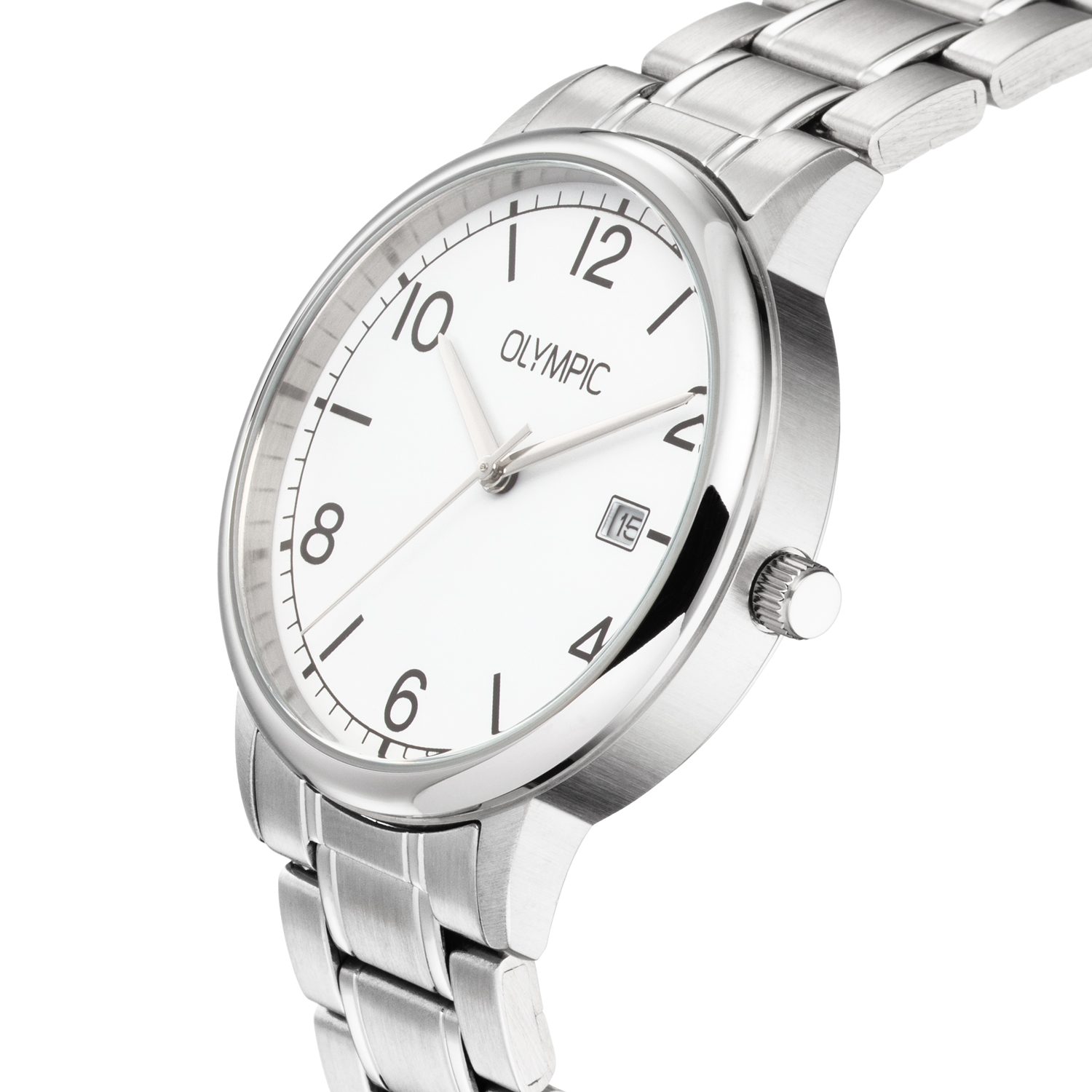 Dit unieke Olympic horloge met artikelnummer: OL80HSS001 is een herenhorloge met een classic sportieve uitstraling. Het horloge heeft een ronde stalen kast met een witte wijzerplaat met een datum. Aan de kast zit een stalen schakelband met vouwsluiting. Het horloge heeft een mineraalglas, een doorsnee van 37mm en is 5ATM.