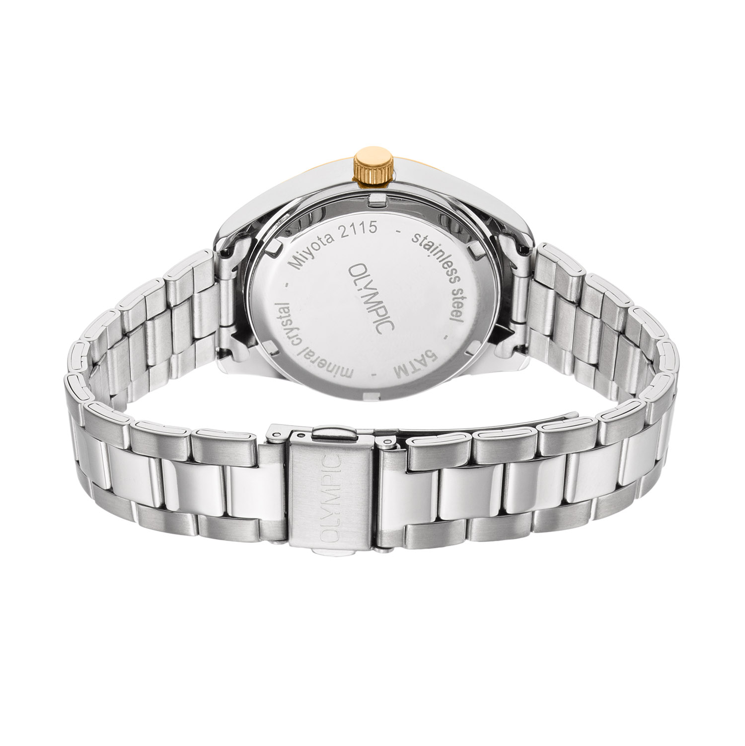 Dit unieke Olympic horloge met artikelnummer: OL75DSS004B is een classic dameshorloge. Het horloge heeft een stalen kast met een glanzende goudkleurige bezel, een witte wijzerplaat met streepjes als uursaanduiding en een datum. Aan de kast zit een stalen schakelband met een vouwsluiting. Het horloge heeft een mineraalglas, een doorsnee van 33mm en is 5ATM.