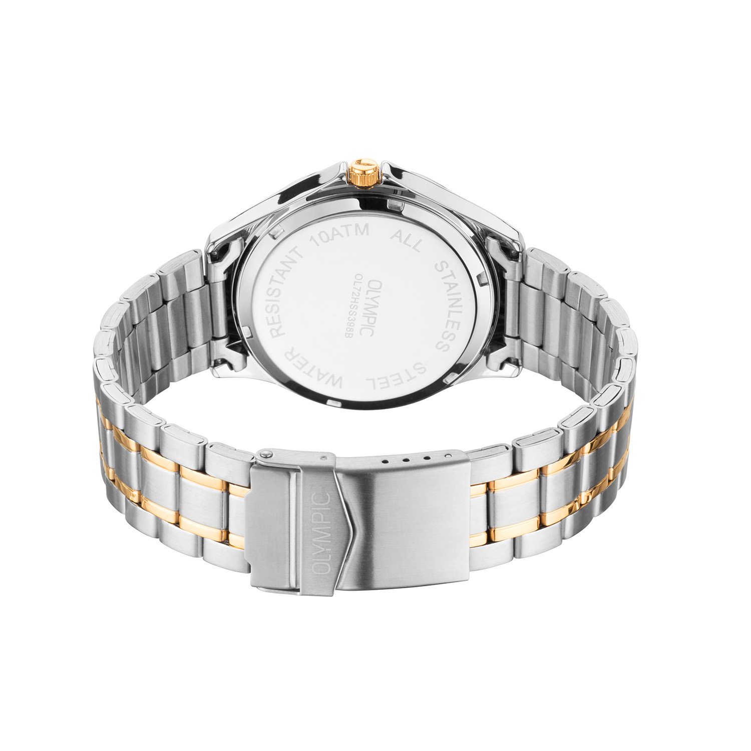 Dit unieke Olympic horloge met artikelnummer: OL72HSS398B is een heren horloge met een classic uitstraling. De stalen kast heeft een gladde goudkleurige bezel en een blauwe wijzerplaat met een datum. De uursaanduiding is opvallend door de Arabische cijfers en de sierlijke wijzers. Dit geeft het horloge een chique uiterlijk. Aan de stalen kast zit een stalen bi-color schakelband met een vouwsluiting. Het horloge heeft een mineraalglas, een doorsnee van 40mm en is 10ATM.