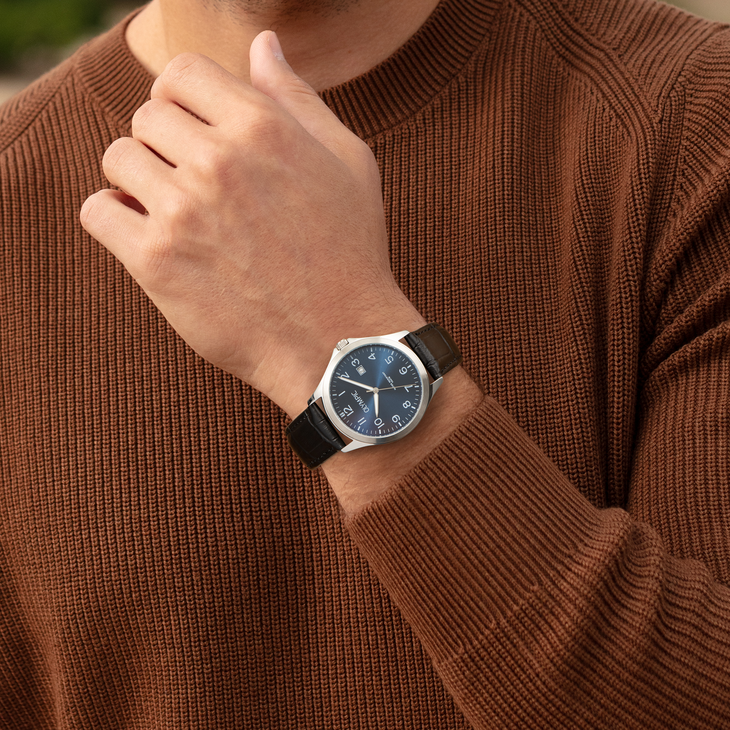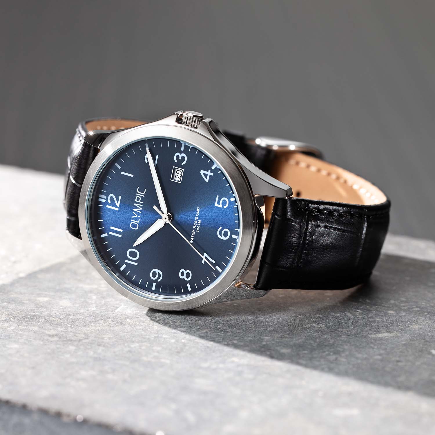 Dit unieke Olympic horloge met artikelnummer: OL72HSL080 is een heren horloge met een classic uitstraling. De stalen kast heeft een gladde bezel en een blauwe wijzerplaat met een datum. De uursaanduiding is opvallend door de Arabische cijfers en de sierlijke wijzers. Dit geeft het horloge een chique uiterlijk. Aan de stalen kast zit een zwarte leren band met een gespsluiting. Het horloge heeft een mineraalglas, een doorsnee van 40mm en is 10ATM.