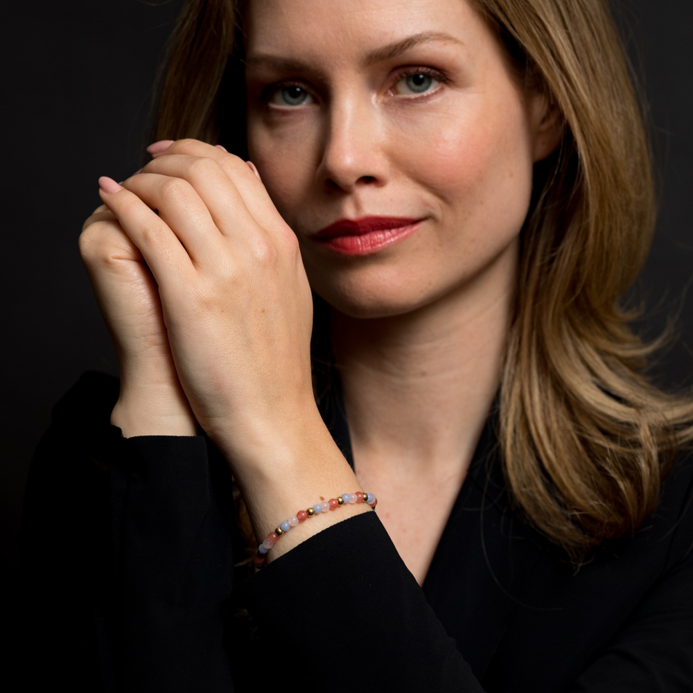 Armband van het merk Rebel & Rose. De armband heeft een hoogwaardige elastische stretch koord, met 4mm van Cherry Quartz, Rose Quartz, Blauwe Agaat, RVS ion-gold plated.