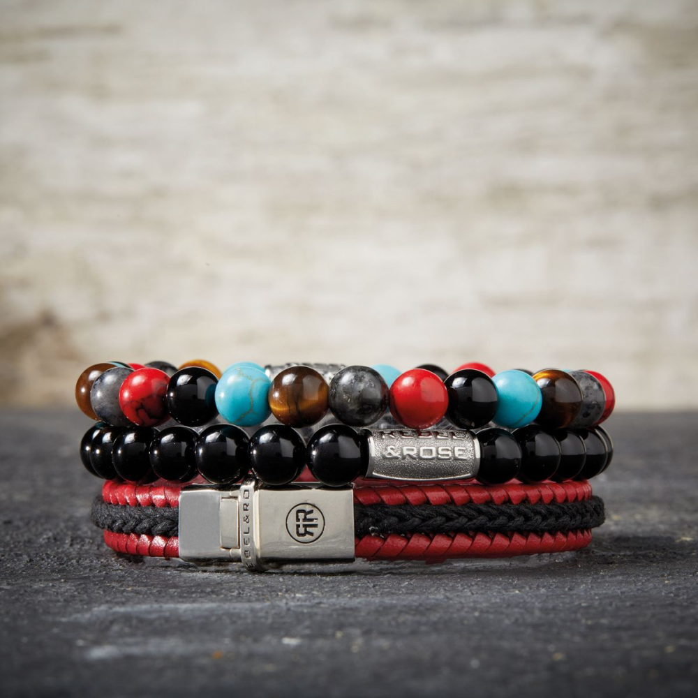 Armband van het merk Rebel & Rose. De armband heeft een hoogwaardige elastische stretch koord, met 8mm van Art. Turquoise, Tijgeroog geel bruin, Larvakiet grijs, Art. Turquoise rood, Onyx zwart.