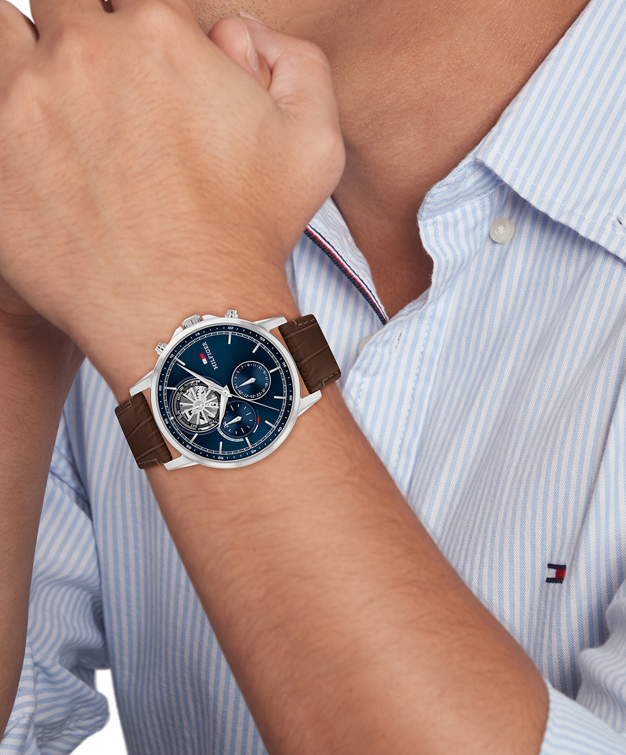 Dit specifieke horloge van Tommy Hilfiger uit de Stewart serie met artikelnr: TH1710629 is een luxe herenhorloge die niet in je collectie mag ontbreken. Het stalen herenhorloge heeft een ronde kast met een gladde bezel en een blauwe wijzerplaat met dag,- datum, en 24-uursaanduiding. De dagen worden weergegeven in een skeleton oog. Aan het horloge zit een bruine leren band met een gespsluiting. Het horloge heeft een mineraalglas, een doorsnee van 44mm en is 5ATM.