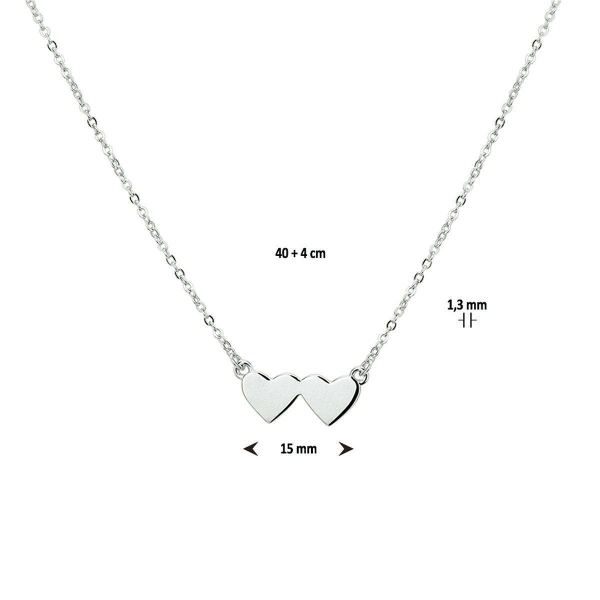 Gerhodineerd zilveren 1.3mm anker collier met een lengte van 40cm met een extensie van 4cm uitgevoerd met 2 poli hartjes van 6.5x15mm. Het collier is te combineren met bijpassende sieraden uit onze collectie.