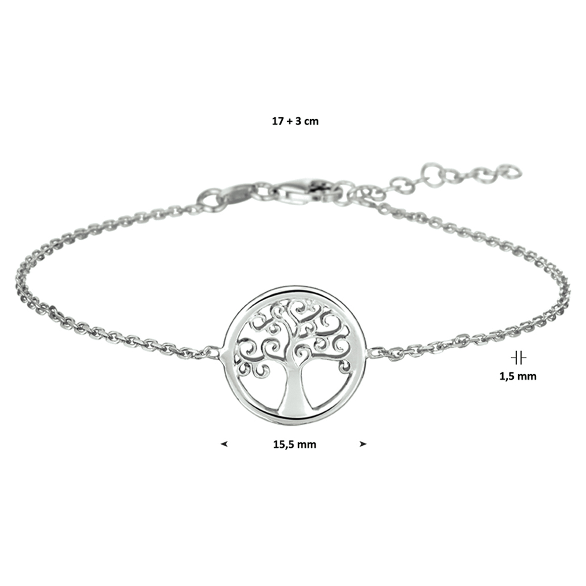 Mooi gerhodineerd 925 zilveren 1.5mm anker armband uitgevoerd met een gedetailleerde levensboom en een stevige karabijn sluiting. De ronde hanger heeft een diameter van 15.5mm. De lengte bedraagt 17cm met 3cm extensie.